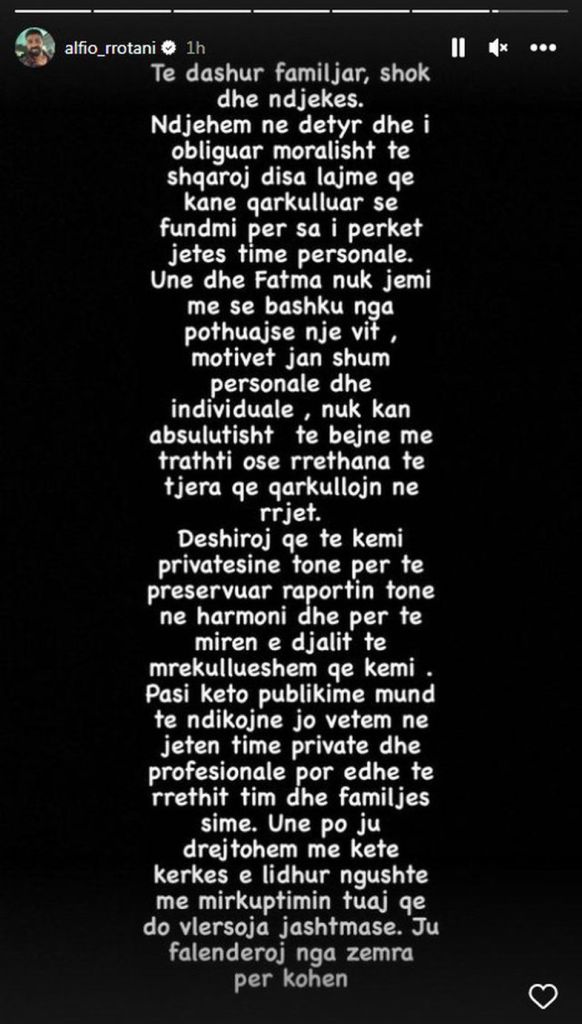 “Të dashur familjarë, shok dhe ndjekës. Ndjehem në detyrë dhe i obliguar moralisht të sqaroj disa lajme që kanë qarkulluar së fundmi për sa i përket jetës sime personale. Unë dhe Fatma nuk jemi më së bashku nga pothuajse një vit,” shkruan ai.