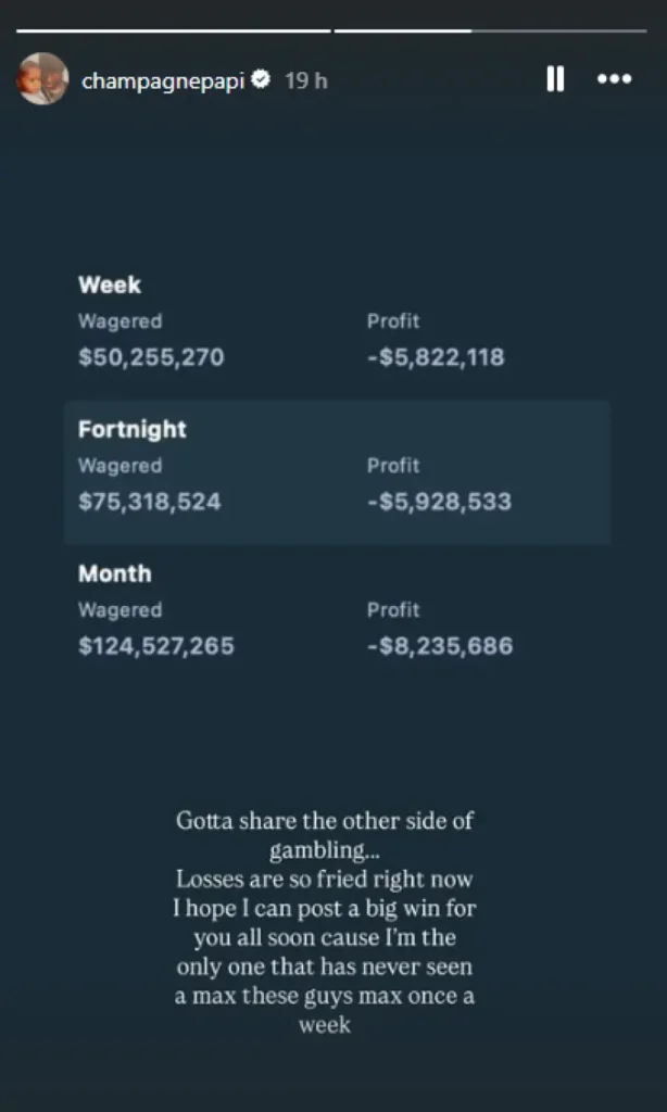 Drake humbi 8 milionë dollarë në bixhoz vetëm në një muaj, zbuloi ai në një postim në rrjetet sociale.
