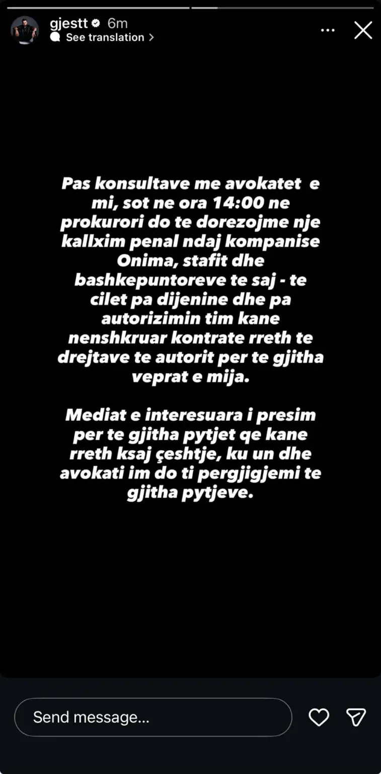 Gjesti ka njoftuar publikisht se do të ndërmarrë hapa ligjorë ndaj kompanisë Onima, duke e akuzuar për shkelje të të drejtave të autorit mbi veprat e tij muzikore. Përmes një reagimi zyrtar, artisti ka bërë të ditur se, pas konsultimeve me ekipin e tij ligjor, ka vendosur të ndjekë rrugën e drejtësisë. Ai ka paralajmëruar se sot, do të depozitojë kallëzim penal në prokurori, jo vetëm ndaj kompanisë Onima, por edhe ndaj stafit dhe bashkëpunëtorëve të saj.