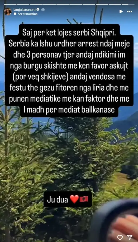 Ish-banorja e njohur e Big Brother VIP Kosova, Juliana Nura, ka reaguar publikisht pas ndeshjes Serbi–Shqipëri, duke zbuluar se autoritetet serbe kanë lëshuar një urdhër arresti ndaj saj dhe tre personave të tjerë, duke e detyruar atë të qëndrojë larg stadiumit.