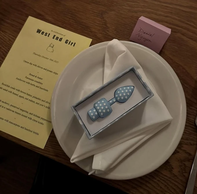 Në darkë, të ftuarit u pritën në tavolinë me diçka të pazakontë. Brenda kutive ishte një dhuratë blu dhe e bardhë në formën e një lodre për të rritur.