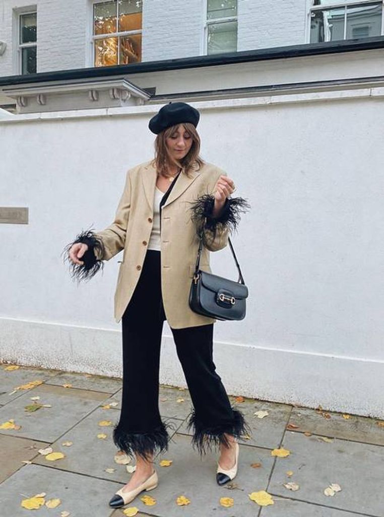 Gjithë veshja e zezë me këpucë të kuqe/portokalli ose një ngjyrë tjetër të fortë dhe të ngrohtë