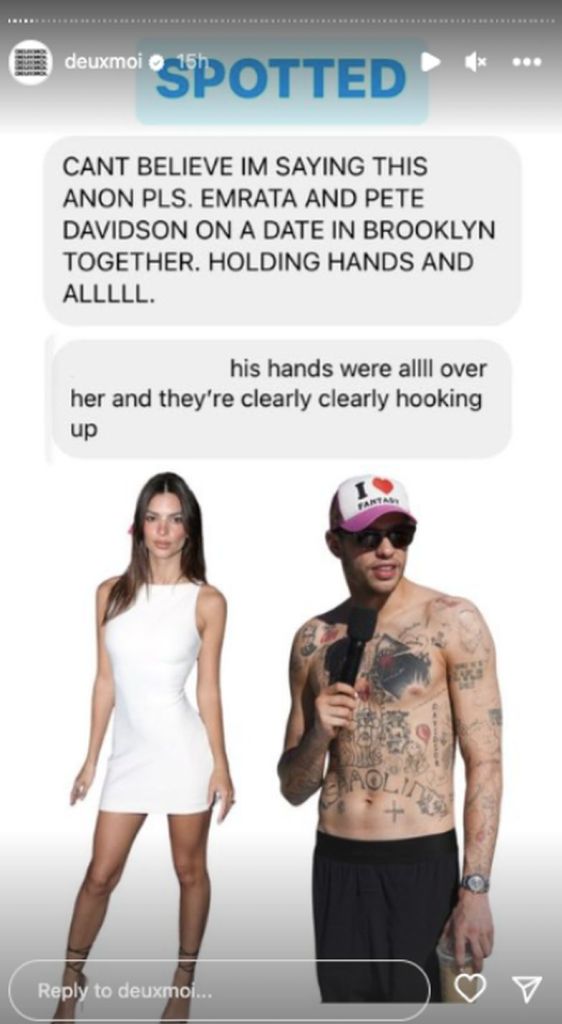 “Nuk mund ta besoj që po e them. Emrata dhe Pete Davidson janë në një takim në Brooklyn. Duke mbajtur duart dhe të gjithaaaa. Duart e tij ishin gjithandej mbi (trupin) e saj dhe qartazi, po dalin bashkë”, shkroi personi anonim.