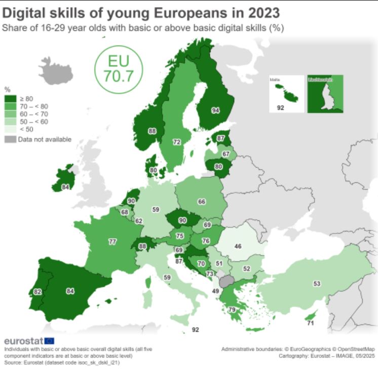 Për t’u ndalur tek aftësitë digjitale, këtu kemi dhe një shifër për Shqipërinë. Këto aftësi, sot konsiderohen si baza për pjesëmarrje të plotë në shoqërinë moderne, gjë që të rinjtë në shumicën e rasteve nuk zhgënjejnë të provojnë dijet e tyre për TIK-un. Në këtë raport, ende nuk ka të dhëna për aftësitë digjitale për vitin 2024, por është bazuar tek ai i vitit 2023. Në vitin 2023, 71% e të rinjve në BE kishin aftësi digjitale bazë ose të avancuara. Finlanda renditet e para (94%), e ndjekur nga Malta (92%) dhe Holanda (90%). Në Shqipëri, në vitin 2023, 49% e popullsisë zotëron aftësi digjitale.