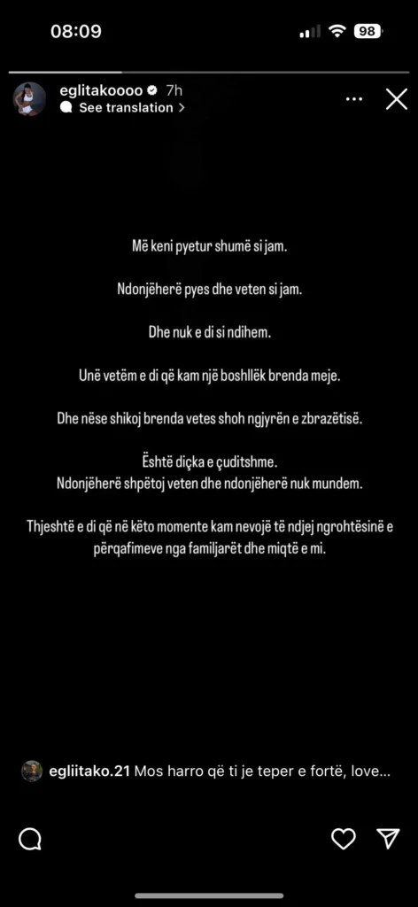 Në një postim në Instastory, ajo ndau një mesazh të ndjerë ku shprehu ndjenjat e saj të pasigurta dhe boshllëkun e brendshëm që ndjen. Egli pranoi se nuk e di saktësisht si ndihet, por theksoi se ka nevojë për ngrohtësinë e