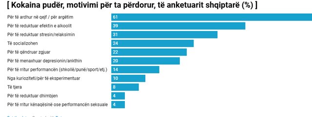 Arsyeja kryesore e përdorimit të kokainës pudër është për të ardhur në qejf/ për argëtim (58%), për të reduktuar efektet e alkoolit (39%), për të reduktuar stresin/relaksuar (31%), për të bërë shoqëri (24%), për të qëndruar zgjuar (22%).