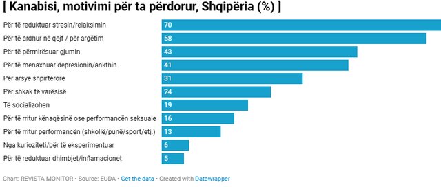 Arsyeja kryesore që i nxit shqiptarët të përdorin kanabis është për të reduktuar stresin dhe për tu relaksuar (70%), për të ardhur në qejf/ për argëtim (58%), për të përmirësuar gjumin (43%), për të menaxhuar depresionin (41%), për arsye spiritualë (31%), për varësu (24%), për të bërë shoqëri (19%).