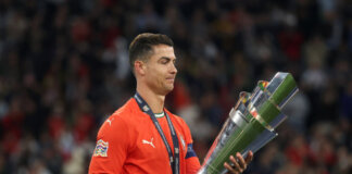 Tifozi bie nga tribuna e stadiumit gjatë ndeshjes Portugali-Spanjë dhe humb...