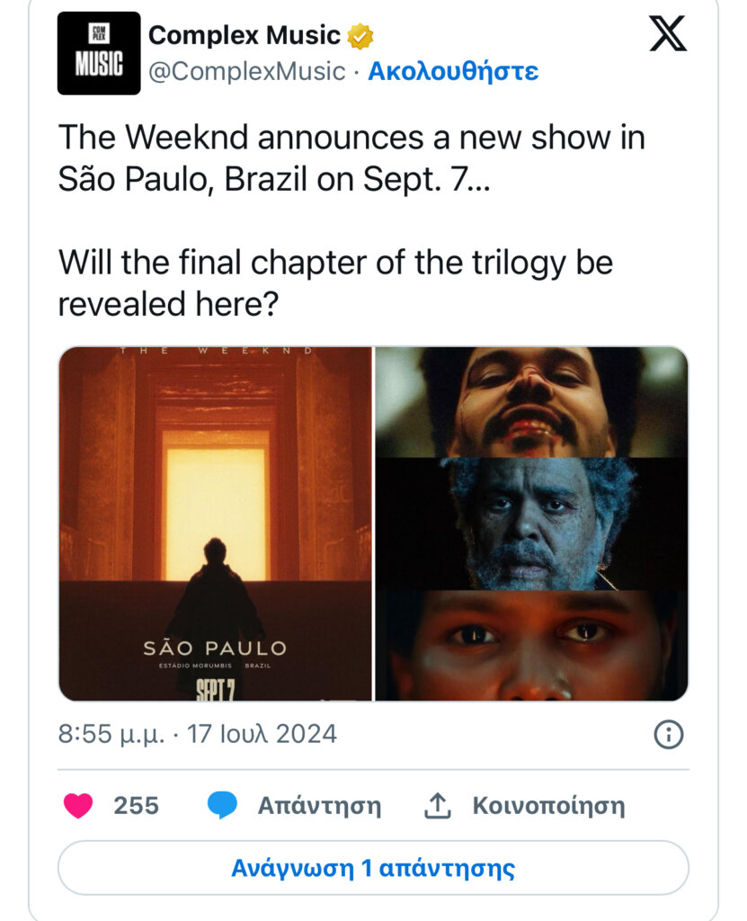 The Weeknd ka njoftuar se ai do të mbajë një koncert special në Brazil vetëm për një natë me një shfaqje krejt të re. Koncerti, i cili do të zhvillohet më 7 shtator, është organizuar në Estádio MorumBIS në São Paulo nga Live Nation.