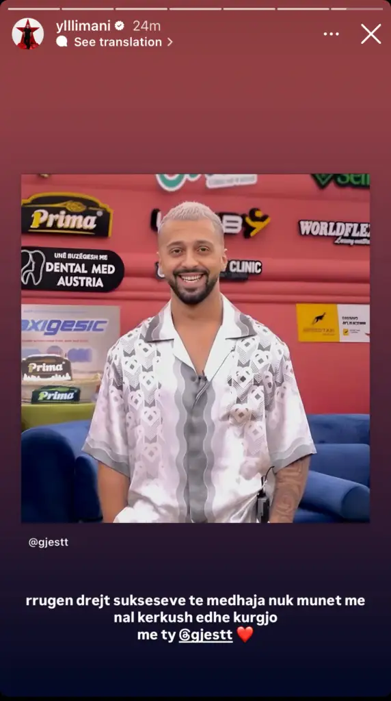 “Rrugën drejt sukseseve të mëdha nuk munet me nal kërkush edhe kurgjo. Me ty @gjesst”, duke e shoqëruar me një zemër të kuqe.