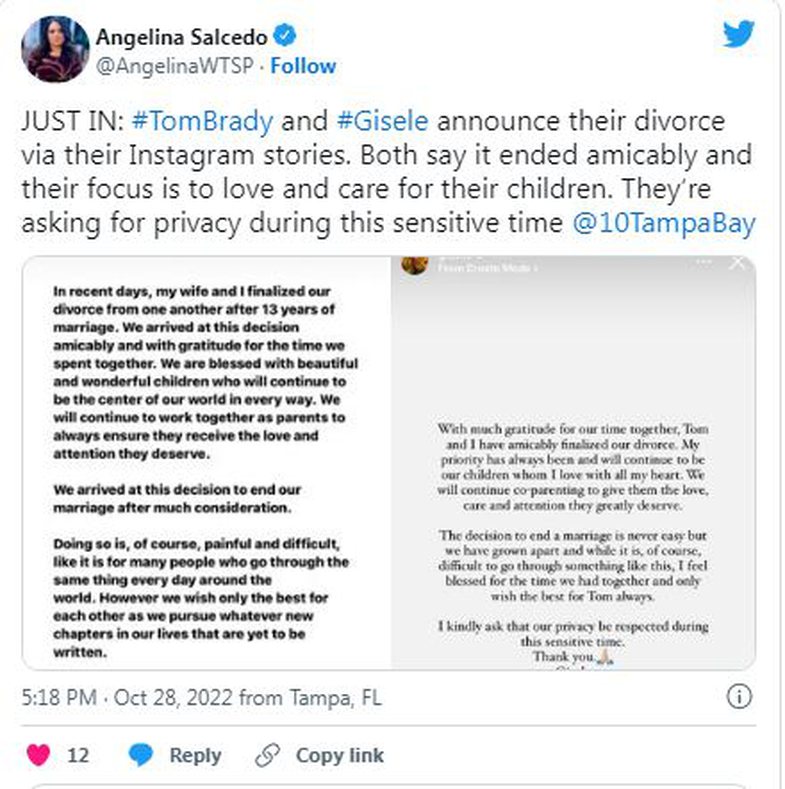 “Me shumë mirënjohje për kohën që kaluam bashkë, unë dhe Tom kemi vendosur të divorcohemi. Prioriteti im gjithmonë ka qenë dhe do të jenë fëmijët që kemi bashkë. Do të vazhdojmë të bashkëprindërojmë për t’i dhënë fëmijëve çfarë meritojnë. Vendimi për t’i dhënë fund martesës s’është kurrë i thjeshtë, por rrugët tona u ndanë dhe sigurisht është e vështirë të thuash diçka të tillë…Ndihem e bekuar për kohën me të dhe uroj për Tom gjithmonë më të mirat.